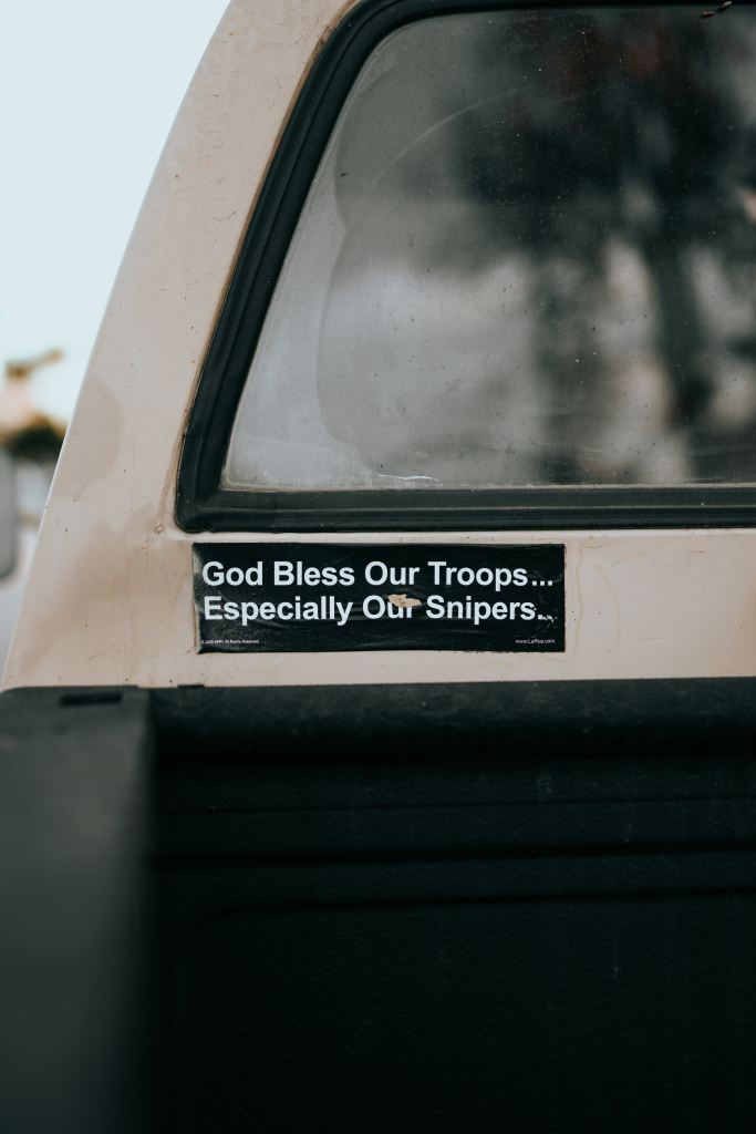 He zoomed in and snapped a pic. “Assault Life” but in the “Salt Life” font, with an assault rifle under it. Across the rest of the glass, a swarm of American flags and Consitution stickers elbowed each other for space, taunting the Libs and giving Critter an idea for a joke. Something about big trucks being popular around here because whatever was written on the back window was the longest thing the owner’s ever read.